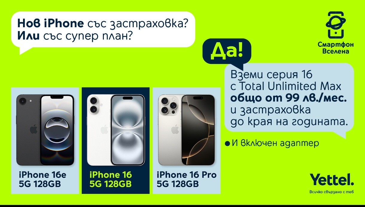 Цените започват от 99 лв. на месец за iPhone 16e 5G 128GB през първата година от договора През целия месец…