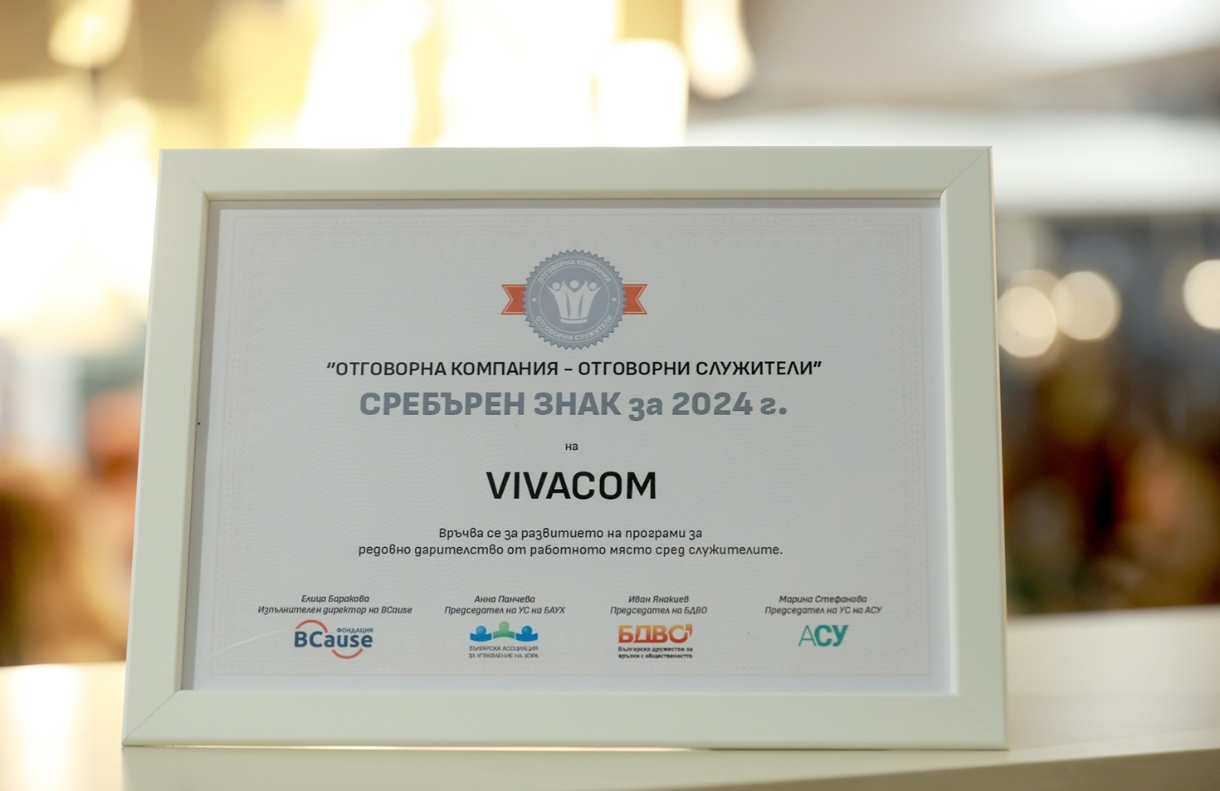 Vivacom получи ценното признание Сребърен знак „Отговорна компания – отговорни служители“ за 2024 година, присъдено от Фондация BCause съвместно с…